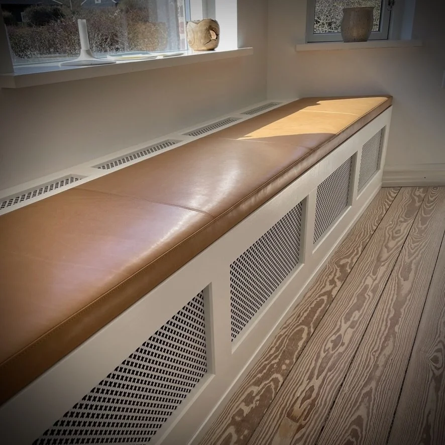 Faste læderhynder til stor buet alkove, betrukket med Vegetal læder fra Sørensen læder. Hynderne er udført med keder og skridsikker underside.