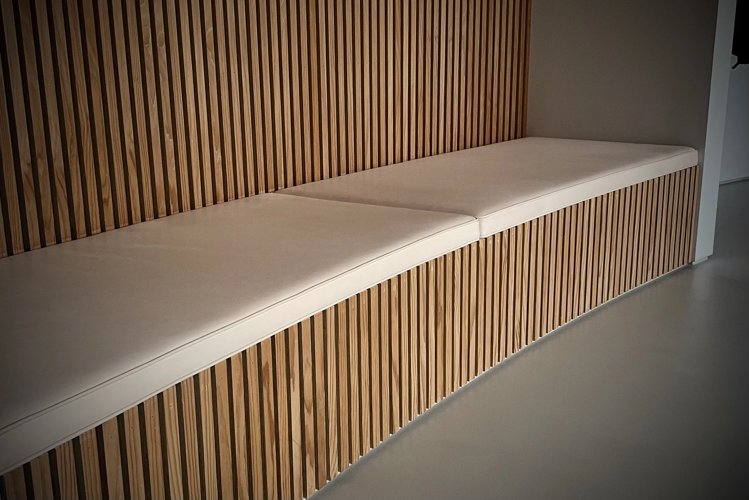 Faste hynder opbygger vi på en tynd ventileret MDF plade. Dette sikre ultra præcis pasform, lang levetid og et stramt udseende. Man undgår samtidigt at betrækket ruller ud over forkanten over tid, da betrækket netop er fastpolstret. Især ved hynder med læder, er det essentielt i vores optik, at fastpolstre betrækket, da læder udvider sig med tiden og dermed bliver mere løst. Højden på en fast hynde laver vi typisk fra 4 cm og op, alt efter kundens ønske.